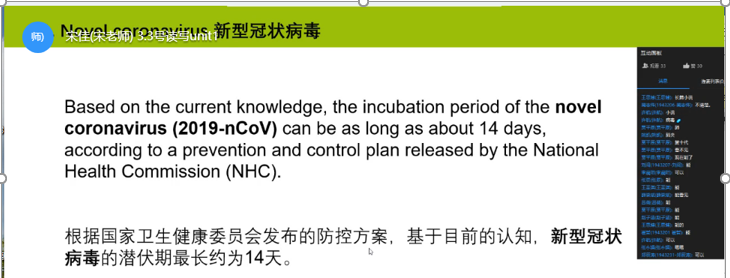 由于是疫情的特殊時期,本階段的在線教學不止局限于讀寫教程的內容,在征求學生意見之后增加了“新冠肺炎疫情雙語教學”內容,每節(jié)課給學生講解5個與新冠肺炎相關的表達方式,讓學生熟悉新聞中頻頻出現的熱點話題的英文表述,引導學生閱讀相關的英語文章,收聽相關的英文報道,以此提升閱讀、聽力能力。同時,在講解過程中引導學生感受中國抗擊疫情的攻堅克難,以及在全球疫情爆發(fā)下所表現的大國擔當,激發(fā)學生的愛國情懷,明確中國立場,體現外語課程思政的育人價值。