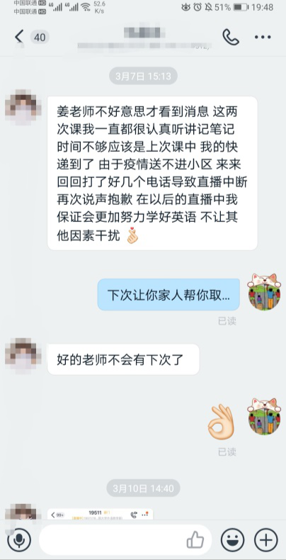 隨著課次的增加,更多的問題也暴露了出來。比如,偶發(fā)的網絡卡頓,學生互動回答問題時有網絡延遲等等。但是,我們準備了對應的“一課一案”。網絡卡頓,我們可以通過觀看回放解決。連麥延遲,我們可以通過文字,語音搞定。網絡質量差,我們有電子課件、PPT、APP來解圍。個別同學沒有網,沒有流量,我們可以開學再補課。那句俗語說得好——“只要思想不滑坡,辦法總比困難多”。
