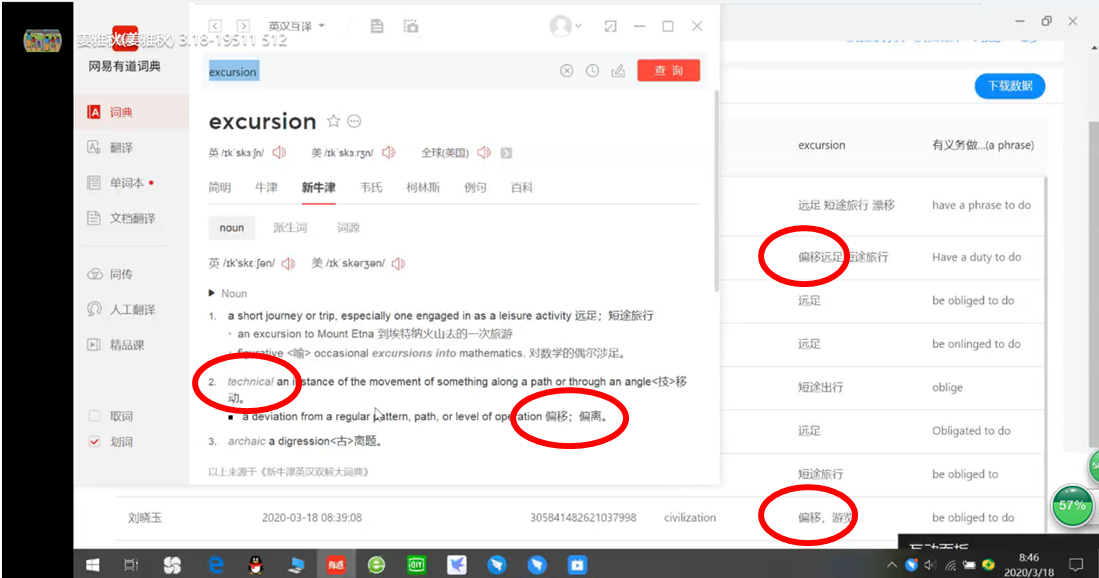 同時我也發(fā)現學生在測試時“偷偷”使用了有道app,(因為他們回答了非書上的而且是最生僻的詞義),我會借此直接把我電腦里的有道詞典打開,“在線破案”,并教他們如何正確合理利用英語字典。