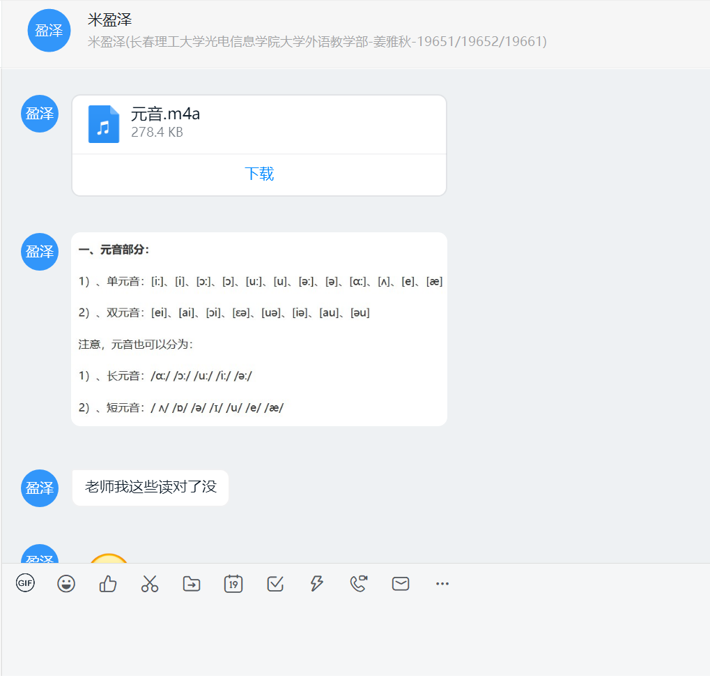 此外,在通過連麥功能抽查作業(yè)完成情況時,如在檢查英語讀單詞作業(yè)時發(fā)現,一些新接手的學生讀單詞存在很大問題,根據不同學生,當場給他們制定不同的學習作業(yè),例如自主練習元音并發(fā)送音頻給我。