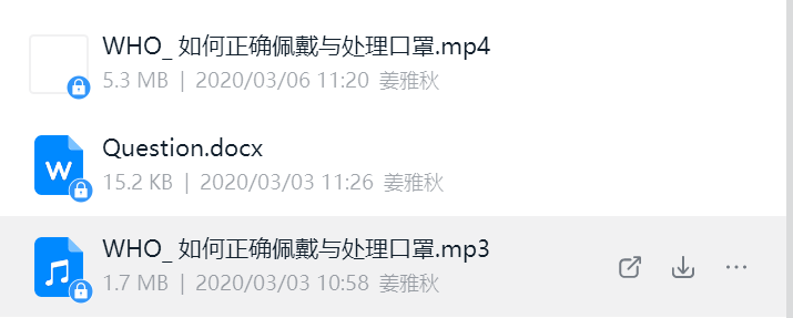 三.普及疫情相關的英文表達,結合思政教育。從本學期開始,我開始給學生布置疫情相關的英語作業(yè),例如世界衛(wèi)生組織發(fā)布的一些科普視頻和各國對于我國在抗擊疫情方面所做出努力的肯定的英文報道,這些視頻的詞匯很普及,難度適宜,適合留作業(yè)精聽。第二天精講,學生感興趣,又不會太耗時間。但一些視頻帶字幕,所以我會轉換成MP3格式,并配套作業(yè)題,發(fā)到釘釘群里,第二天講完題再播放MP4。