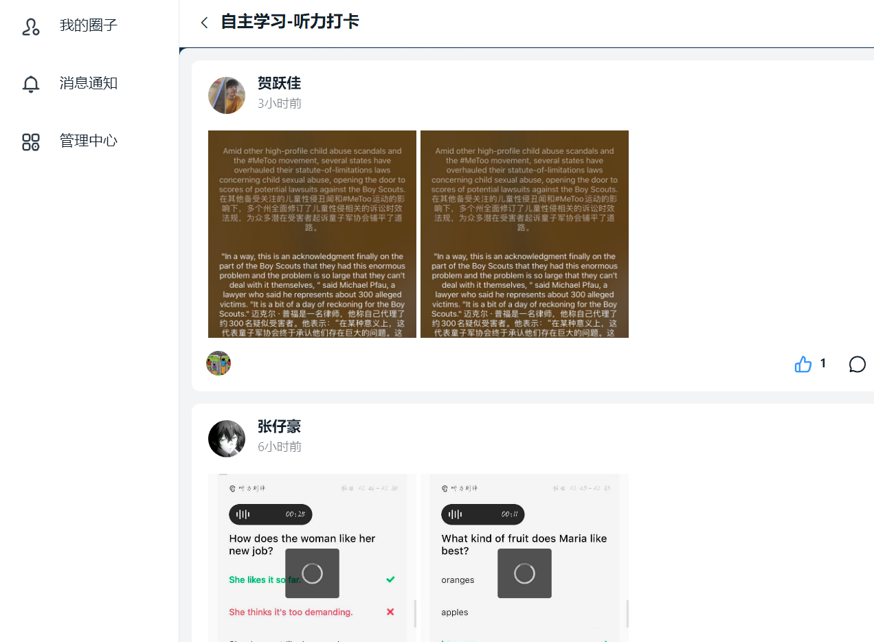 為學生提供各種學習軟件,學習平臺。通過閱讀學生的“每日學習反饋”,了解學生每天在英語學習方面的收獲,培養(yǎng)學生“終生學習”習慣。