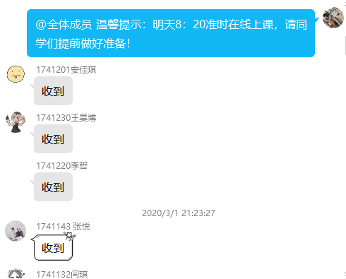 1)例如上午第一節(jié)課是8:30分正式上課,每次都會在前一天晚上和第二天早晨多次提醒同學們準時上課,提前十分鐘開啟會議模式確保每位學生在線聽課。