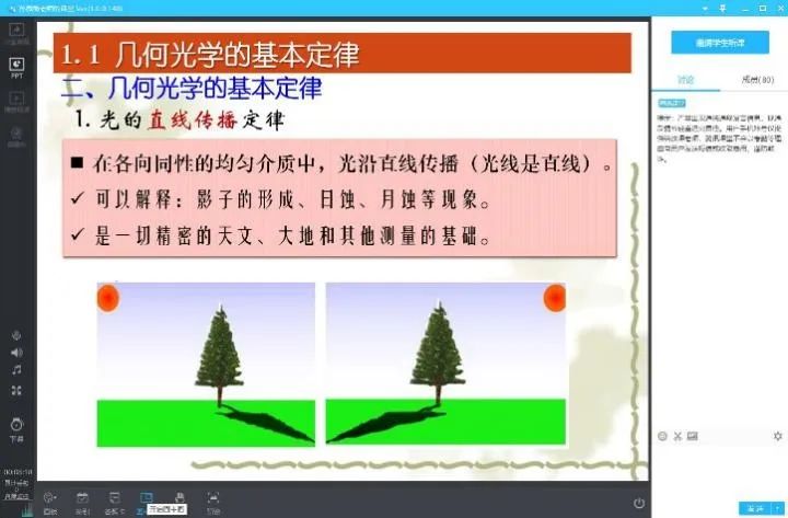 預先想好每一個環(huán)節(jié)的問題,隨機抽查學生提問,以便監(jiān)督學生更好完成課程任務,應用光學的知識點基本圍繞直線傳播、折反定律,大部分的同學高中都有比較好的基礎,因此對于每一個問題同學們都討論的很熱情,課堂互動非常積極。
