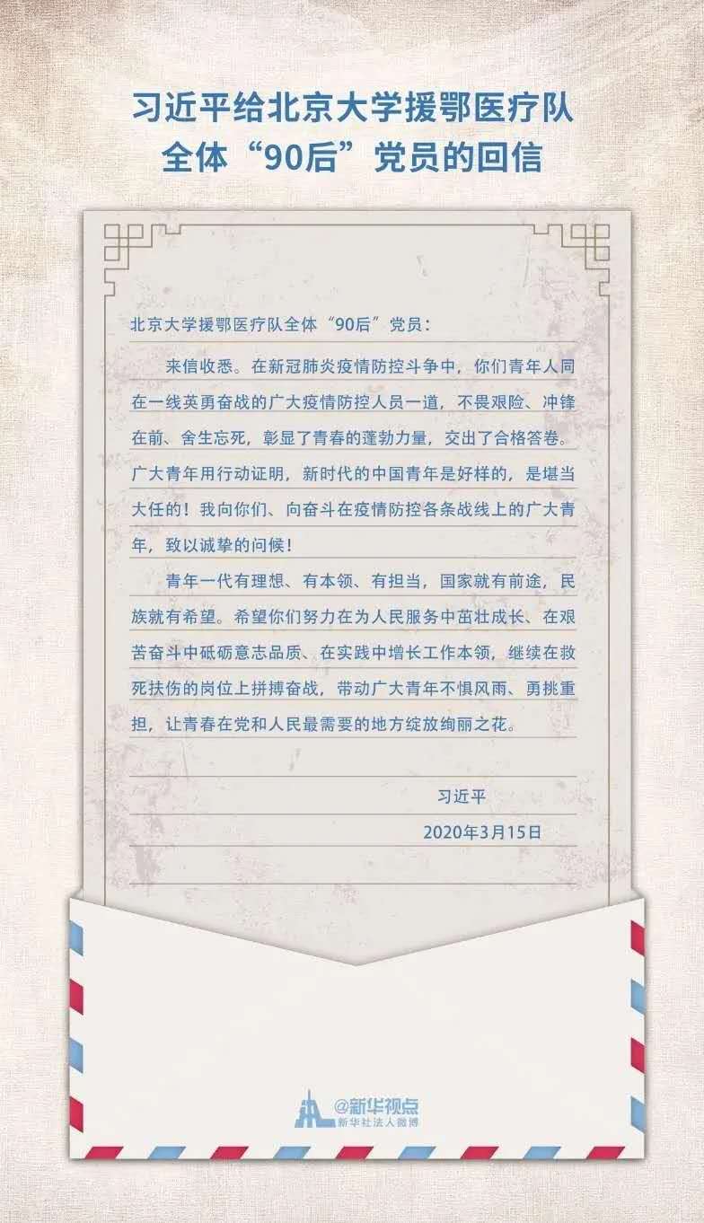 中共中央總書(shū)記、國(guó)家主席、中央軍委主席習(xí)近平3月15日給北京大學(xué)援鄂醫(yī)療隊(duì)全體“90后”黨員回信,向他們和奮斗在疫情防控各條戰(zhàn)線上的廣大青年致以誠(chéng)摯的問(wèn)候。