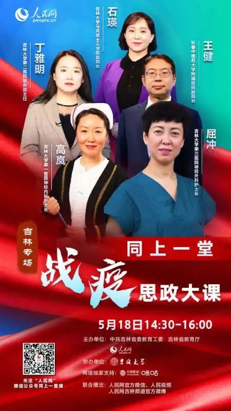 2020年5月18日,吉林省高校大學(xué)生在云端“同上一堂戰(zhàn)疫思政大課”。本次“思政大課”特邀吉林省援鄂醫(yī)療隊隊員,吉林大學(xué)第一醫(yī)院神經(jīng)內(nèi)科護(hù)士長高嵐、吉林大學(xué)第二醫(yī)院醫(yī)務(wù)部主任丁雅明、吉林大學(xué)中日聯(lián)誼醫(yī)院神經(jīng)外二科護(hù)士長屈沖、長春中醫(yī)藥大學(xué)附屬醫(yī)院副院長王健為主講嘉賓。