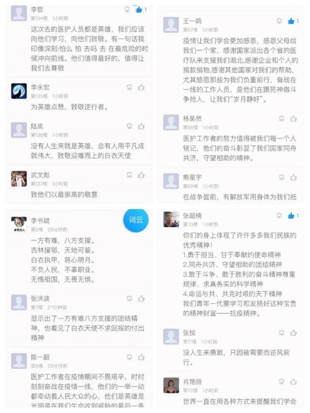 “作為一名思政教師,我看后感觸很多。最美“逆行者”們他們用行動向我們詮釋了什么是大愛無疆。生命還有很長,愿我們每個人都有自己的責(zé)任擔(dān)當(dāng),做一個善良的能發(fā)出光和熱的人。沒有什么闖不過的難關(guān),沒有什么邁不過的坎,中國是一個英雄的國度,全國人民團結(jié)一心,終有風(fēng)雨過后見彩虹的一天。你的心,我的心,萬眾一心;你的力,我的力,千鈞之力。在災(zāi)難中相互扶助,展現(xiàn)中華民族生生不息的精神力量。”