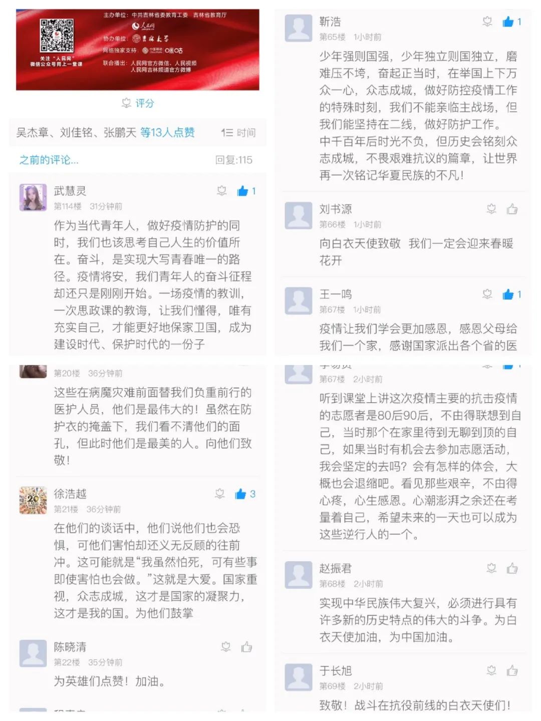 “思政大課”感人至深,讓人淚目,發(fā)人深省。課后我校師生情緒高漲,在線圍繞這次“思政大課”展開熱烈討論交流,表達(dá)對醫(yī)護(hù)工作者的贊美,談自己是如何在家抗“疫”的,有的同學(xué)規(guī)劃自己人生目標(biāo)表達(dá)愛國情懷……
