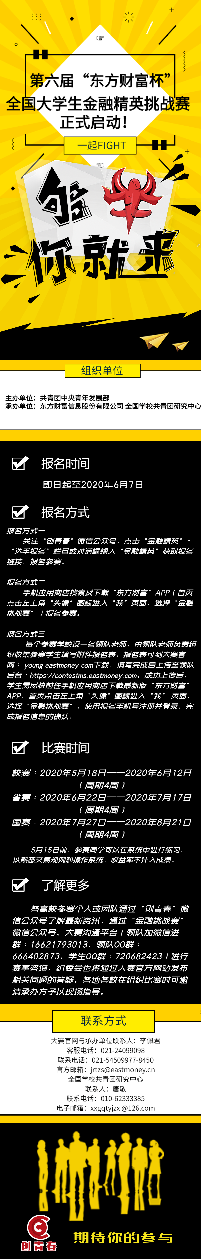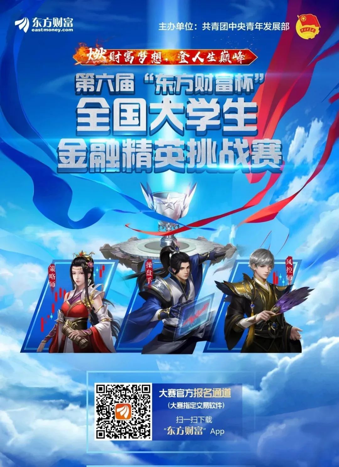 第六屆“東方財富杯”全國大學(xué)生金融精英挑戰(zhàn)賽,分為校賽、省賽和國賽三個階段。參賽學(xué)生及團(tuán)隊使用大賽專用平臺,以滬深上市的A股品種進(jìn)行比拼。