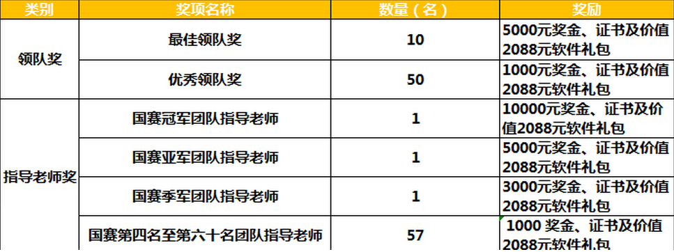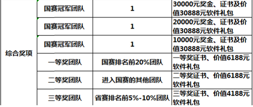 國賽冠軍團(tuán)隊獲30000元獎金及證書;國賽亞軍團(tuán)隊獲20000元獎金及證書;國賽季軍團(tuán)隊獲10000元獎金及證書,國賽冠亞季軍團(tuán)隊成員均可獲得價值30888元的軟件大禮包一份。