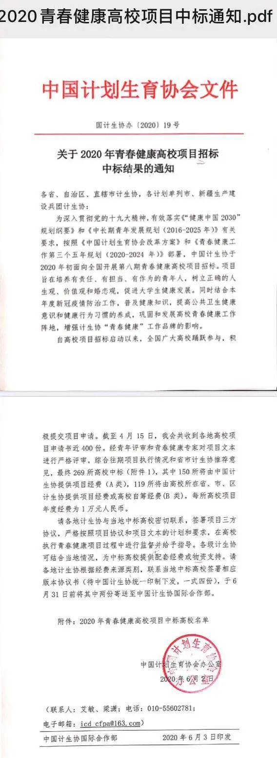 “自2019年我校第一次申請(qǐng)?jiān)擁?xiàng)目,已連續(xù)兩年中標(biāo)并獲得中國(guó)計(jì)生協(xié)提供的項(xiàng)目經(jīng)費(fèi)(A類(lèi))”