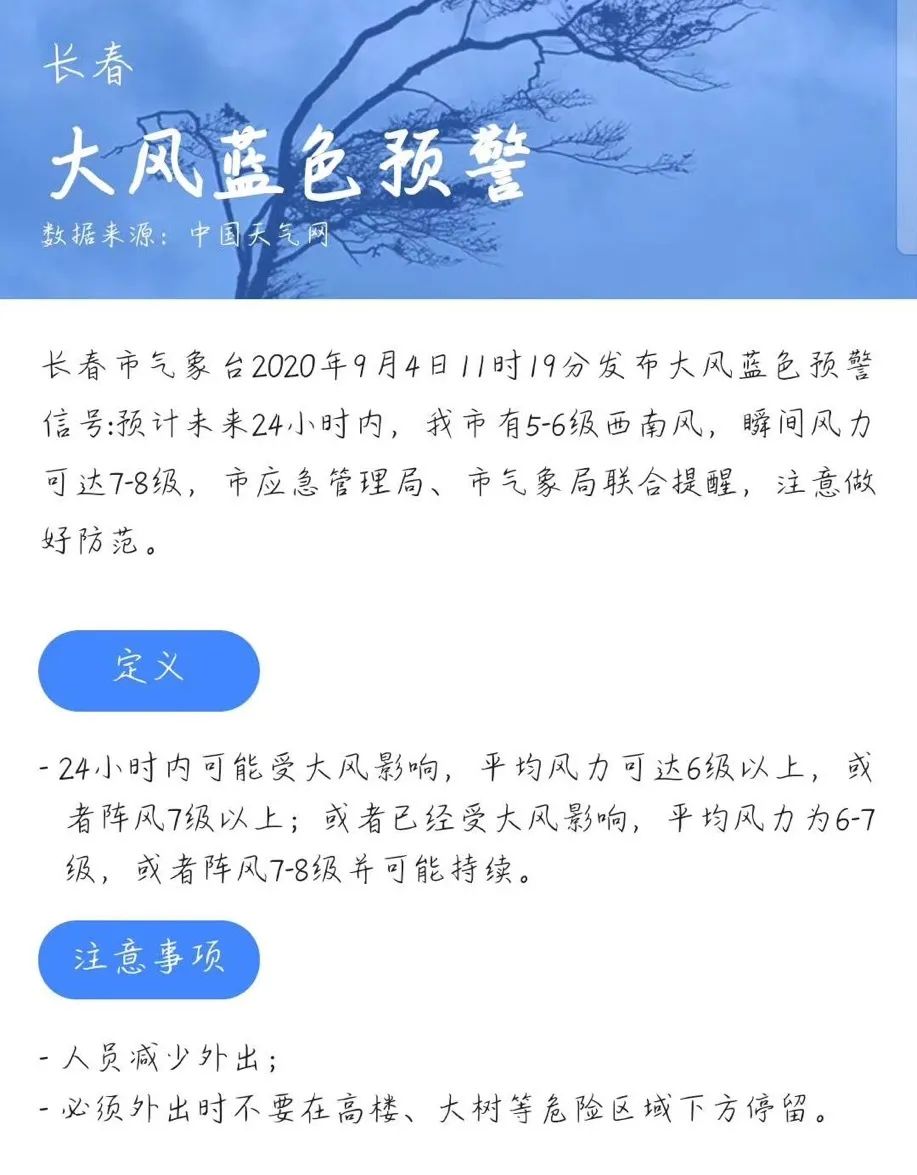 吉林省長(zhǎng)春市氣象臺(tái)2020年9月4日11時(shí)19分發(fā)布大風(fēng)藍(lán)色預(yù)警信號(hào):預(yù)計(jì)未來(lái)24小時(shí)內(nèi),我市有5-6級(jí)西南風(fēng),瞬間風(fēng)力可達(dá)7-8級(jí)。