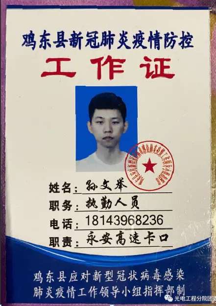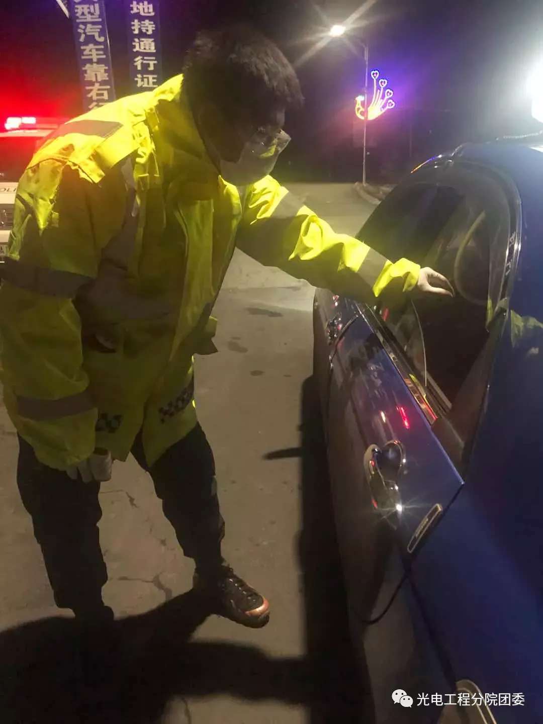 1 月 25 日,寒風凜冽,雞東縣人 、車流量較大的入縣口檢查點一群身著黃色雨衣的志愿者堅守在卡點,對來往的車輛和人員登記、測溫。這群志愿者中,就有光電工程學院大三學生孫文舉,除夕夜他也參加志愿者活動,放棄了與家人團聚!