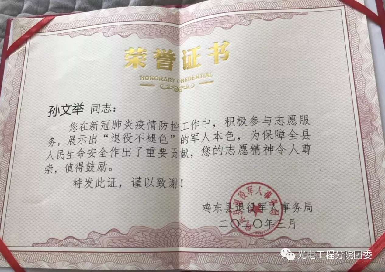 因此,雞東縣退役軍人事務局對孫文舉同學的所為作出表彰,以此來肯定他在當?shù)匾咔槠陂g所做出的貢獻和對他的嘉獎。
