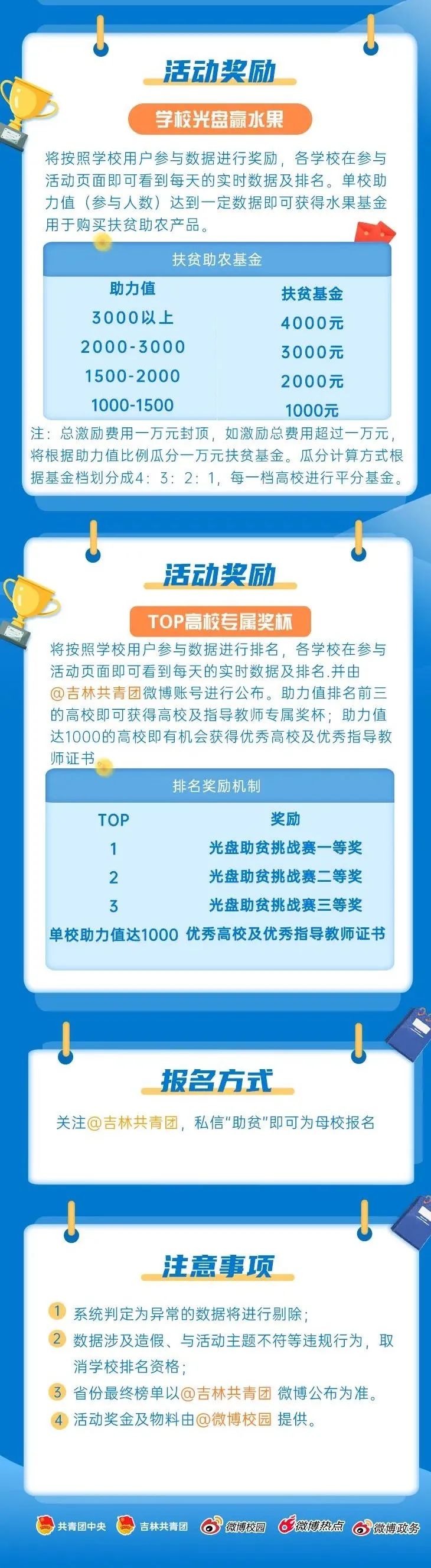 為在全社會倡導(dǎo)、營造“浪費(fèi)可恥、節(jié)約為榮”的氛圍,引領(lǐng)新時代的青少年爭做厲行節(jié)約、反對浪費(fèi)的踐行者、示范者、推動者,@共青團(tuán)中央 、@吉林共青團(tuán)、@微博校園、@微博熱點(diǎn)、@微博政務(wù)、@長春校園聯(lián)合發(fā)起了“光盤接力,助力扶貧”——吉林省高校助貧挑戰(zhàn)賽!