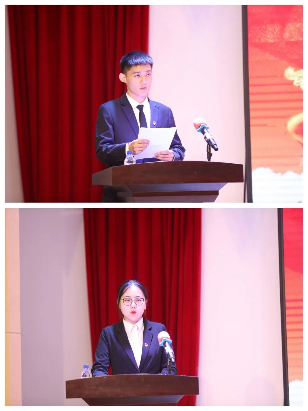 接下來(lái),由學(xué)生黨員代表董超、陸浙洲上臺(tái)發(fā)言。