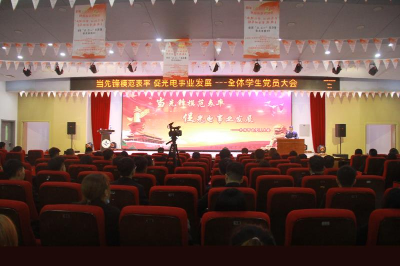 為認(rèn)真總結(jié)幾年來(lái)我校學(xué)生黨員不斷提高黨性修養(yǎng),增強(qiáng)黨員意識(shí),為學(xué)校的改革、發(fā)展和建設(shè)中做出的貢獻(xiàn),全面梳理存在的問(wèn)題和不足,進(jìn)一步明確我校學(xué)生黨員今后為中華民族偉大復(fù)興及我校建設(shè)發(fā)展中所承擔(dān)的任務(wù),學(xué)校黨委于2020年10月28日下午在圖書館報(bào)告廳召開(kāi)了以“當(dāng)先鋒模范表率,促光電事業(yè)發(fā)展”為主題的全體學(xué)生黨員大會(huì)。黨委書記韓秋葉、各分院黨總支副書記、全體輔導(dǎo)員和全體學(xué)生黨員參加此次會(huì)議,會(huì)議由黨務(wù)工作部部長(zhǎng)范爽主持。