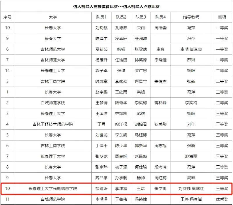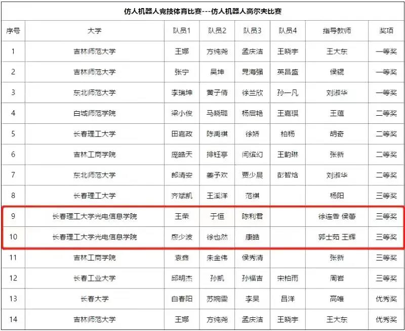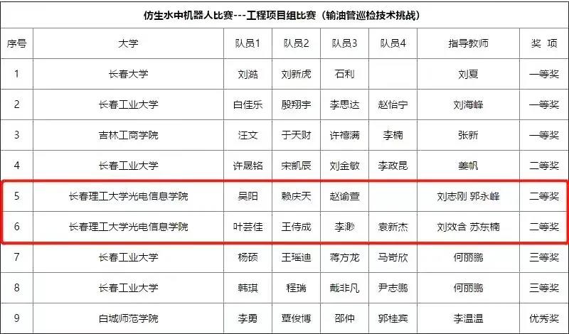 長(zhǎng)春理工大學(xué)光電信息學(xué)院機(jī)電工程學(xué)院劉志剛、郭永峰、劉效含、蘇東楠老師指導(dǎo)的兩組“仿生水中機(jī)器人比賽(輸油管巡檢技術(shù)挑戰(zhàn))”代表隊(duì)從眾多參賽隊(duì)伍中脫穎而出,奪得本次大賽工程項(xiàng)目組比賽的二等獎(jiǎng);劉薇娜、吳翠紅老師指導(dǎo)的“仿人機(jī)器人競(jìng)技體育比賽——仿人機(jī)器人點(diǎn)球比賽”獲得三等獎(jiǎng);徐連香、侯蕾、郭士茹、王輝老師指導(dǎo)的兩組“仿人機(jī)器人競(jìng)技體育比賽——仿人機(jī)器人高爾夫比賽”獲得三等獎(jiǎng)。