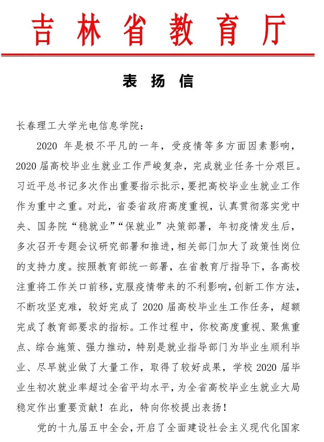 近日,吉林省教育廳向我校發(fā)來一封表揚(yáng)信,信中指出:在 2020 屆畢業(yè)生就業(yè)工作過程中,長春理工大學(xué)光電信息學(xué)院高度重視、聚焦重點(diǎn)、綜合施策、強(qiáng)力推動,特別是就業(yè)指導(dǎo)部門為畢業(yè)生順利畢業(yè)、盡早就業(yè)做了大量工作,取得了較好效果,學(xué)校 2020 屆畢業(yè)生初次就業(yè)率超過全省平均水平,為穩(wěn)定全省高校畢業(yè)生就業(yè)大局做出了重要貢獻(xiàn)。