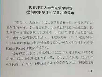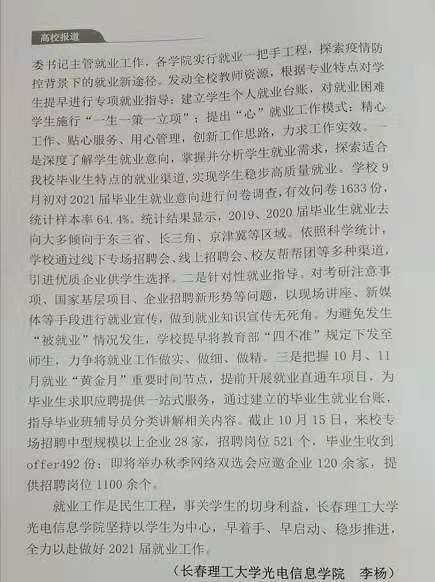 我校招生就業(yè)處李楊處長圍繞“深度了解需求、全程宣講指導(dǎo)、力促充分就業(yè)”三個方面撰寫的學(xué)校就業(yè)工作簡訊在省教育廳主辦的《就業(yè)工作簡報》全文刊發(fā),對我校就業(yè)工作開展給予了充分認(rèn)可。