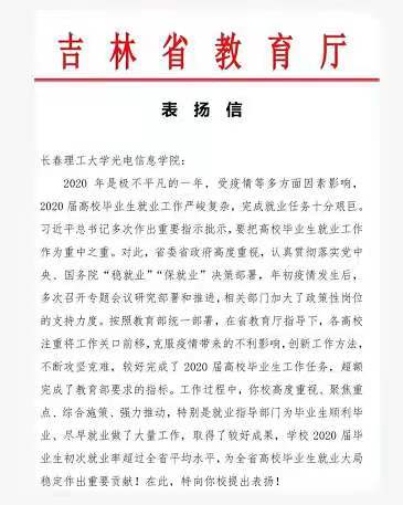 吉林省教育廳特別向我校發(fā)來表揚信,指出在 2020 年畢業(yè)生就業(yè)工作過程中,我校高度重視、聚焦重點、綜合施策、強力推動,為畢業(yè)生順利畢業(yè)、盡早就業(yè)做了大量工作,取得了較好效果,學(xué)校 2020 屆畢業(yè)生初次就業(yè)率超過全省平均水平,為穩(wěn)定全省高校畢業(yè)生就業(yè)大局做出了重要貢獻(xiàn)。