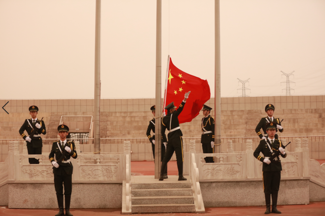 伴隨著莊嚴(yán)的《義勇軍進(jìn)行曲》,全體師生莊嚴(yán)肅立,英姿颯爽的國旗護(hù)衛(wèi)隊(duì)將五星紅旗冉冉升起,迎風(fēng)飄揚(yáng)。
