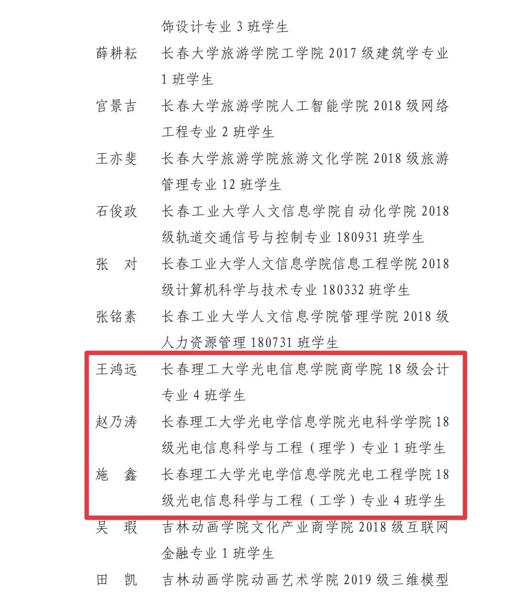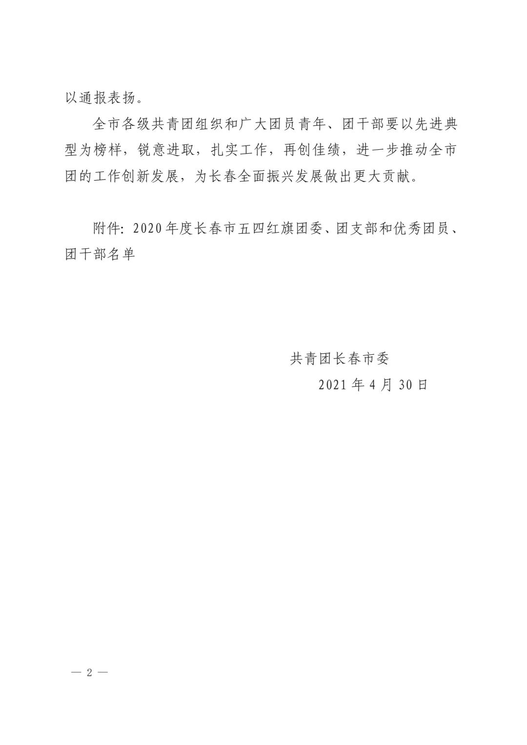 關(guān)于對(duì) 2020 年度長春市五四紅旗團(tuán)委、團(tuán)支部和優(yōu)秀團(tuán)員、團(tuán)干部予以通報(bào)表揚(yáng)的決定以下是我校在此次長春市五四表彰中所獲得的榮譽(yù)稱號(hào):