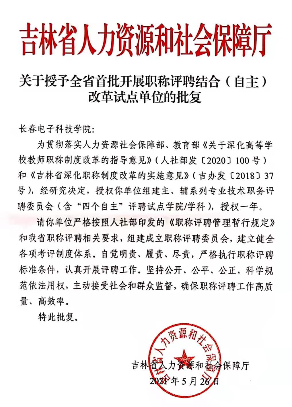 2021 年 5 月 27 日,吉林省人力資源和社會(huì)保障廳召開《2021 年全省評(píng)聘結(jié)合高等學(xué)校職稱評(píng)聘首批授權(quán)會(huì)議》。會(huì)上印發(fā)了《關(guān)于授權(quán)全省首批開展職稱評(píng)聘結(jié)合(自主)改革試點(diǎn)單位的批復(fù)》,我校被納入職稱評(píng)聘結(jié)合改革試點(diǎn)單位,授權(quán)組建主、輔系列專業(yè)技術(shù)職務(wù)評(píng)聘委員會(huì)。