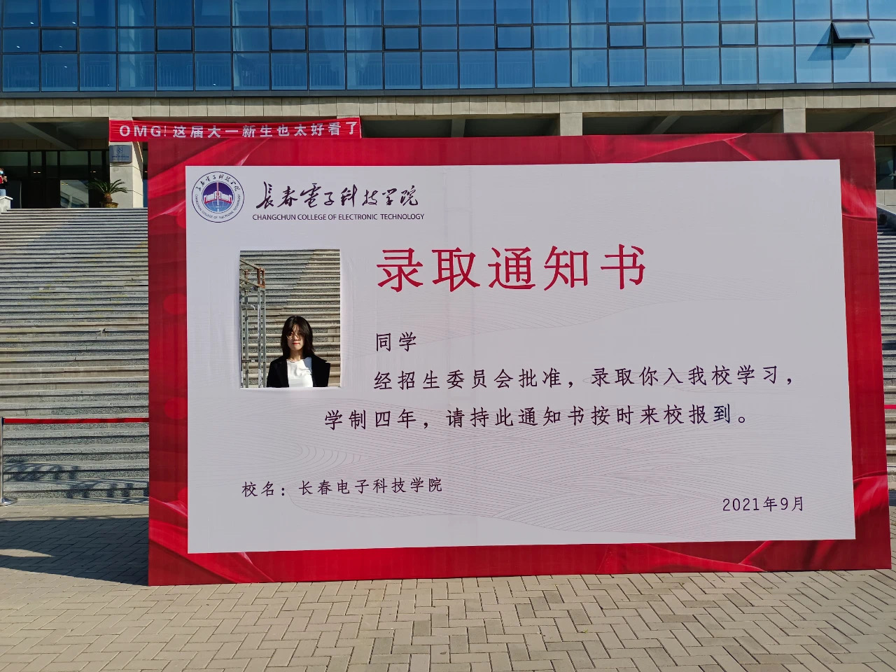站在錄取通知書牌后