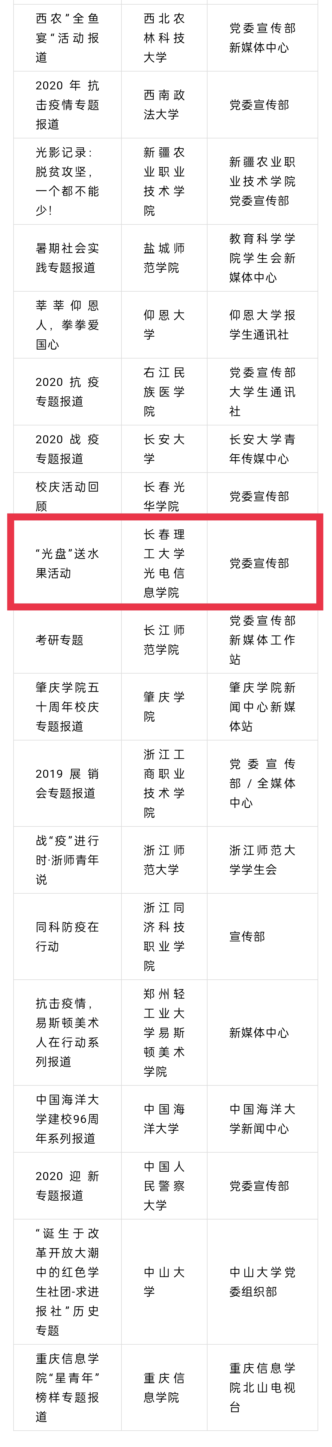 在 2020 年度中國青年報社、中國青少年新媒體協(xié)會、中青校媒聯(lián)合舉辦的“高校新聞扶持計劃”中,我校黨委宣傳部及下屬大學(xué)生新媒體中心“光盤送水果活動”榮獲全國百強校媒融合新聞專題“2020年度百強校園新聞專題作品”!吉林省僅有兩所學(xué)校獲此殊榮,我校是其中一所!