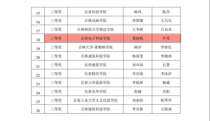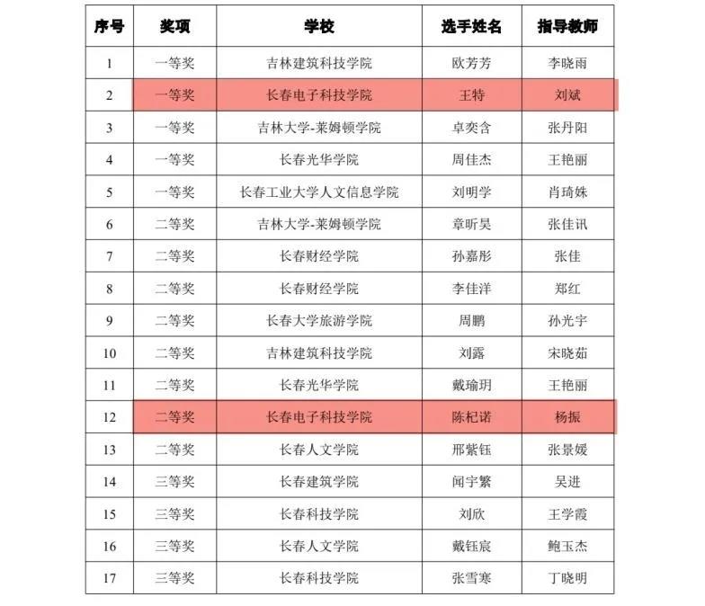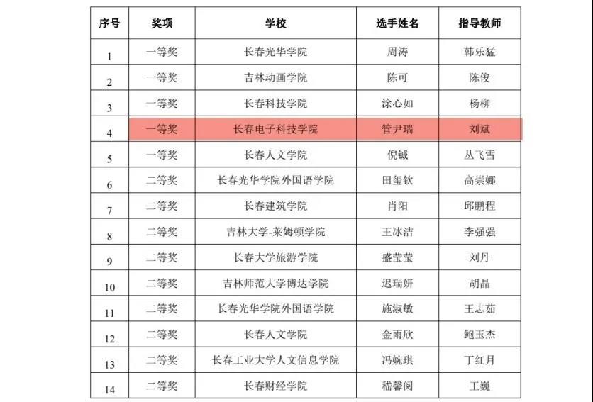 本次吉林省賽區(qū)決賽有寫作大賽和閱讀大賽,寫作大賽共有來自我省35所院校篩選出來的72位選手參加,閱讀大賽共有來自我省38所院校的89名選手參加。經過賽前的精心準備,我校參賽選手在激烈角逐中脫穎而出,由大學外語教學部劉斌老師指導的學生王特和管尹瑞分別獲得寫作大賽一等獎與閱讀大賽一等獎;楊振老師指導的學生陳杞諾獲得寫作大賽二等獎;車雪老師指導的學生葛揚帆獲得閱讀大賽三等獎。