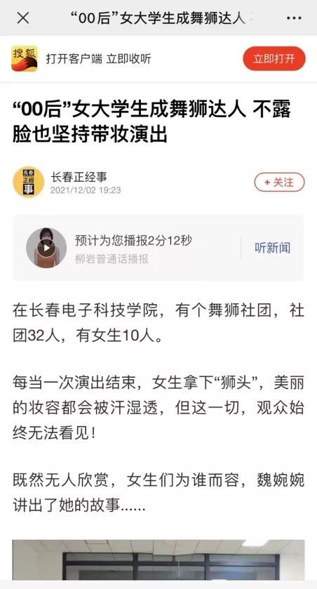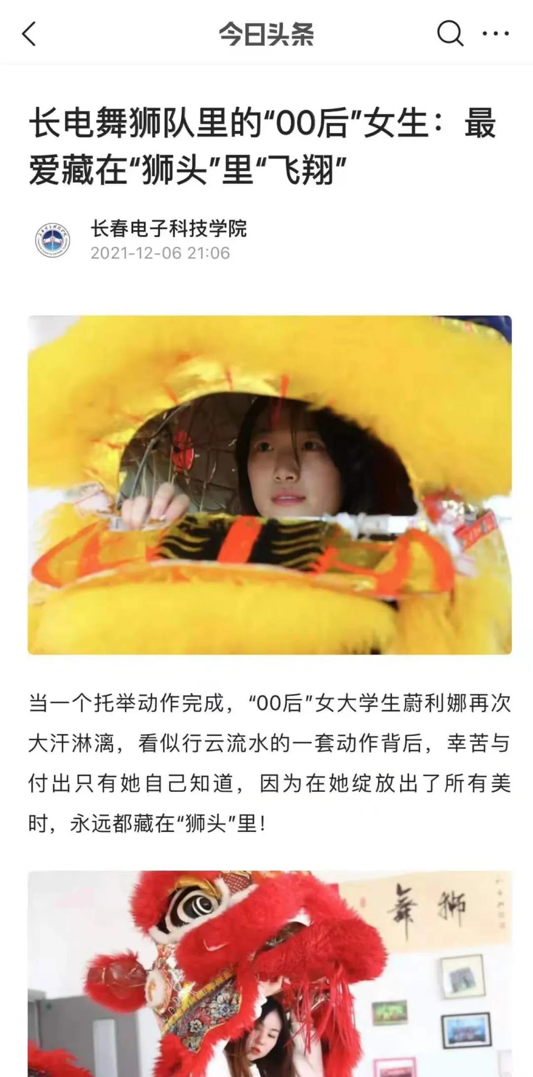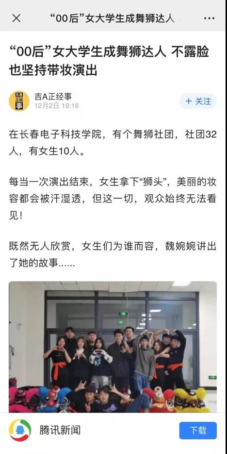 有這樣一群女大學(xué)生,在舞臺上身披舞獅彩妝,在男舞伴的托舉下完成一個又一個的高難度動作,綻放傳統(tǒng)文化舞獅的光彩,在她們綻放出了所有美時,真實(shí)面目卻一直藏在獅頭下。她們來自長春電子科技學(xué)院舞獅社團(tuán),在這個社團(tuán),共有10名女生,她們都有一個愛好,就是藏在“獅頭”里“飛翔”。