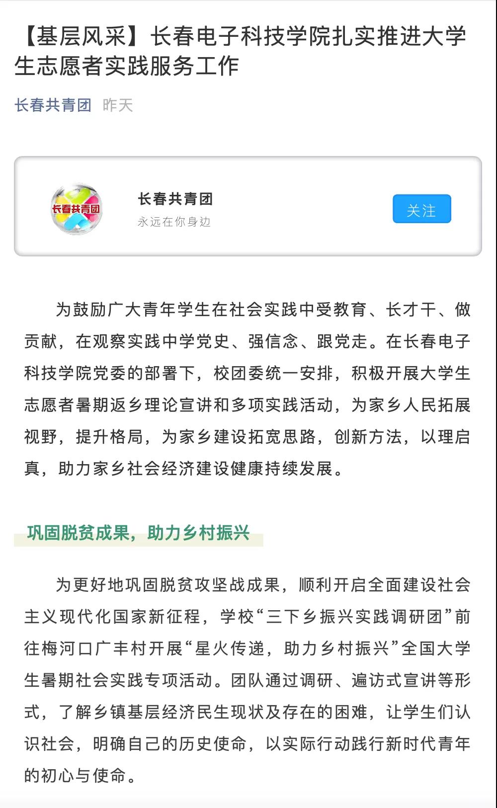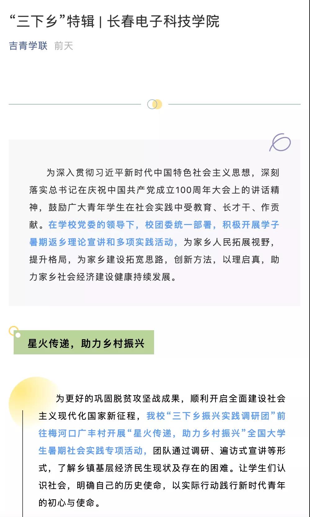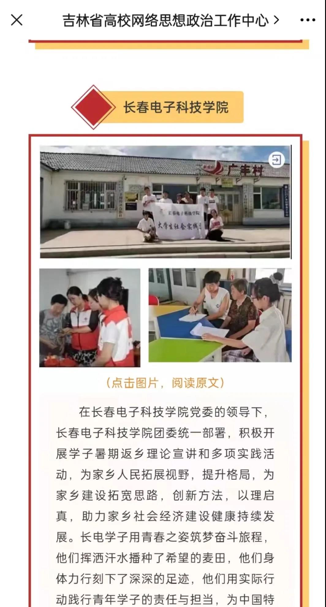團(tuán)市委、吉青學(xué)聯(lián)、吉思資訊相繼報道長春電子科技學(xué)院暑期“三下鄉(xiāng)”社會實踐活動
