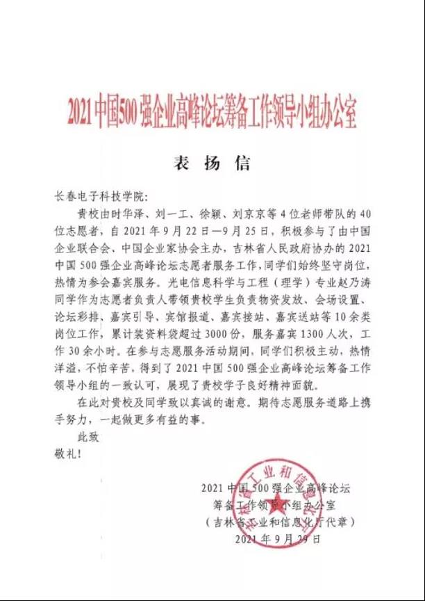 近日,長春電子科技學(xué)院收到2021年中國500強(qiáng)企業(yè)高峰論壇籌備工作領(lǐng)導(dǎo)小組辦公室發(fā)來的表揚(yáng)信。對長春電子科技學(xué)院的4位帶隊(duì)老師和志愿者們無私奉獻(xiàn)、辛勞付出給予高度肯定和衷心的感謝。