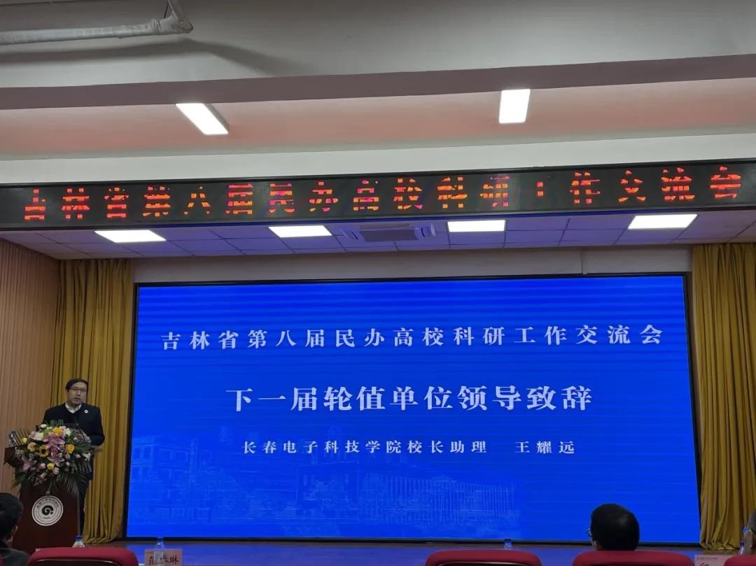本次會(huì)議的最后一項(xiàng)內(nèi)容,由我校校長(zhǎng)助理王耀遠(yuǎn)代表下一屆主辦方致辭。他首先對(duì)各民辦高校的信任表示感謝,并介紹了我校近年來在科研工作上的重要舉措和取得的主要成效,最后誠摯邀請(qǐng)大家明年相聚長(zhǎng)春電子科技學(xué)院,共襄第九屆吉林省民辦高??蒲泄ぷ髡呗?lián)席盛會(huì)。