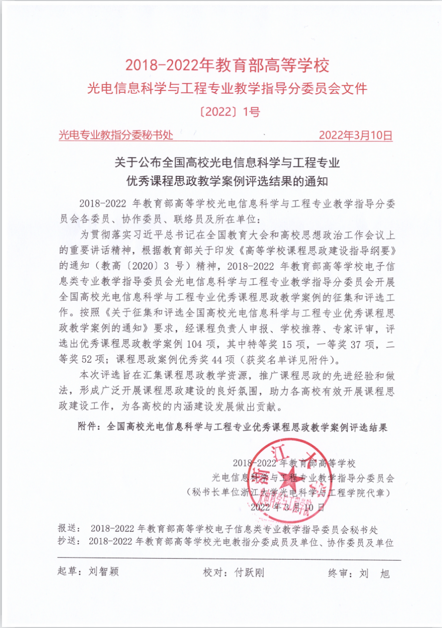 為貫徹落實(shí)習(xí)近平總書記在全國(guó)教育大會(huì)和高校思想政治工作會(huì)議上的重要講話精神,根據(jù)教育部關(guān)于印發(fā)《高等學(xué)校課程思政建設(shè)指導(dǎo)綱要》的通知(教高(2020 )3 號(hào))精神,2018 -2022 年教育部高等學(xué)校電子信息類專業(yè)教學(xué)指導(dǎo)委員會(huì)光電信息科學(xué)與工程專業(yè)教學(xué)指導(dǎo)分委員會(huì)開展全國(guó)高校光電信息科學(xué)與工程專業(yè)優(yōu)秀課程思政教學(xué)案例的征集和評(píng)選工作。