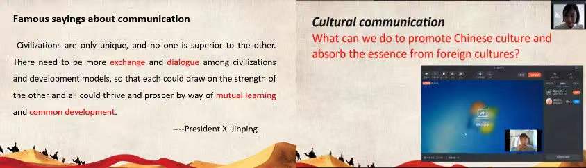 課中:本章主講Cultureshock,根據課程特點,孫博老師介紹孔子和蘇格拉底兩位教育家、哲學家,學生以寢室為小組進行頭腦風暴、互相交流,找出兩位觀點的相同與不同之處,老師在做出歸納總結,同時,通過讓同學連麥發(fā)言完成課后翻譯練習,在學習英語語言文化知識和提高語言能力的過程中融入了中國優(yōu)秀傳統(tǒng)文化,豐富了英語課程本身的內涵,加強了自身的思辨能力。授課期間,以孔子的“有朋自遠方來不亦樂乎”為契機,帶領同學們了解近期熱點事件----剛結束的北京冬殘奧會,增加了學生們的詞匯儲備,拓展同學們的閱讀量,了解四六級考試的熱門選題。