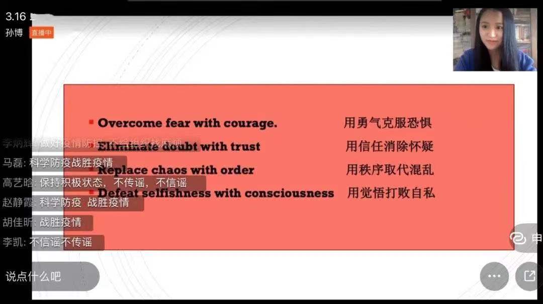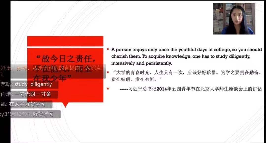 為舒緩近期學生受疫情影響所造成的心理壓力,孫博老師開展課前暖心三分鐘活動,通過直播彈幕和連麥交流了解學生近況,對學生進行了心理疏導。提煉近期新聞重點詞匯和短語,通過學習語言,潛移默化地激發(fā)學生對抗疫工作者的敬意和感恩,敦促學生在疫情中保持理性,滿懷信心,做有覺悟,有情懷,有擔當的青年人。隨后引用習近平總書記五四青年節(jié)在北京大學師生座談會上的講話,勉勵同學們珍惜青春時光,學知識,學做事,保持積極心態(tài)弘揚正能量。引導學生體會“故今日之責任,不在他人,而全在我少年”在新時代中的蘊含之義,即新時代青年是祖國的棟梁,應當承擔起應有的社會責任。