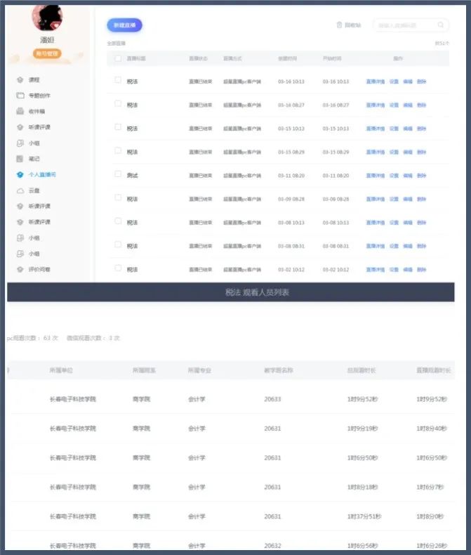 2.利用超星直播平臺(tái)完成線上直播課,不僅課程內(nèi)容可以記錄,可以回放,有利于學(xué)生課后復(fù)習(xí),而且通過后臺(tái)數(shù)據(jù)分析,可以實(shí)時(shí)掌握學(xué)生的在線聽課情況,將學(xué)生觀看直播課程、參與直播互動(dòng)答題等成績(jī)直接計(jì)入學(xué)習(xí)通綜合成績(jī)當(dāng)中,完善學(xué)生的成績(jī)考核體系。