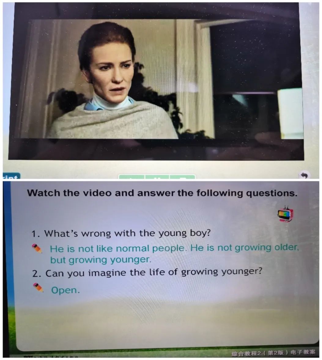 1. 首先伊老師以一段電影的片段,引發(fā)學(xué)生積極思考,闡釋本篇文章的主題:變老的優(yōu)點(diǎn)。