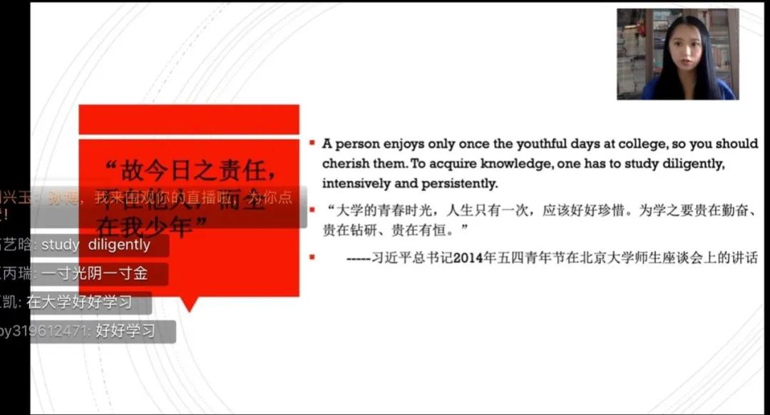為舒緩近期學(xué)生受疫情影響所造成的心理壓力,孫博老師開展課前暖心三分鐘活動(dòng),通過直播彈幕和連麥交流了解學(xué)生近況,對(duì)學(xué)生進(jìn)行了心理疏導(dǎo)。隨后引用習(xí)近平總書記五四青年節(jié)在北京大學(xué)師生座談會(huì)上的講話,勉勵(lì)同學(xué)們珍惜青春時(shí)光,學(xué)知識(shí),學(xué)做事,保持積極心態(tài)弘揚(yáng)正能量。