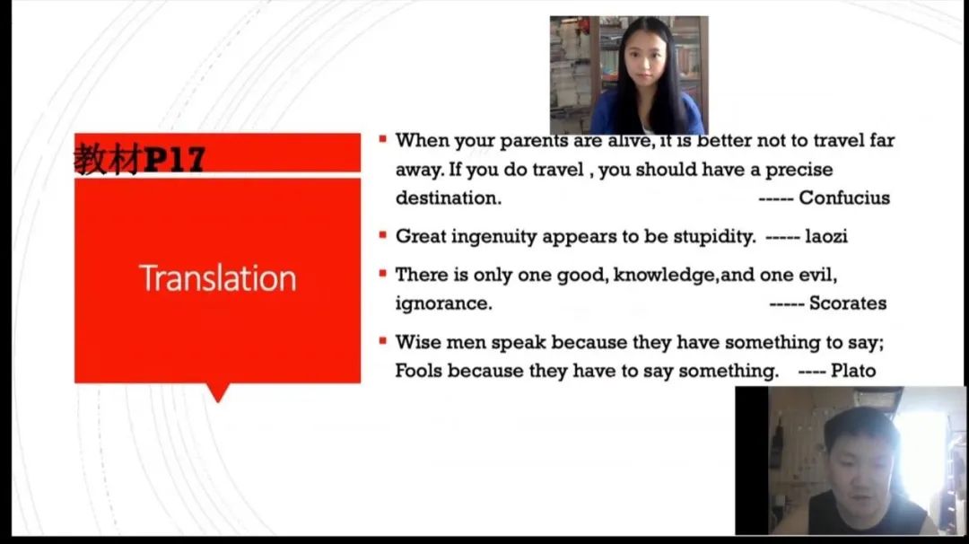 本章主講Culture shock,根據(jù)課程特點(diǎn),孫博老師介紹孔子和蘇格拉底兩位教育家、哲學(xué)家,學(xué)生以寢室為小組進(jìn)行頭腦風(fēng)暴、互相交流,找出兩位觀點(diǎn)的相同與不同之處,老師在做出歸納總結(jié),同時(shí),通過讓同學(xué)連麥發(fā)言完成課后翻譯練習(xí),在學(xué)習(xí)英語語言文化知識(shí)和提高語言能力的過程中融入了中國(guó)優(yōu)秀傳統(tǒng)文化,豐富了英語課程本身的內(nèi)涵,加強(qiáng)了自身的思辨能力。授課期間,以孔子的“有朋自遠(yuǎn)方來不亦樂乎” 為契機(jī),帶領(lǐng)同學(xué)們了解近期熱點(diǎn)事件----剛結(jié)束的北京冬殘奧會(huì),增加了學(xué)生們的詞匯儲(chǔ)備,拓展同學(xué)們的閱讀量,了解四六級(jí)考試的熱門選題。
