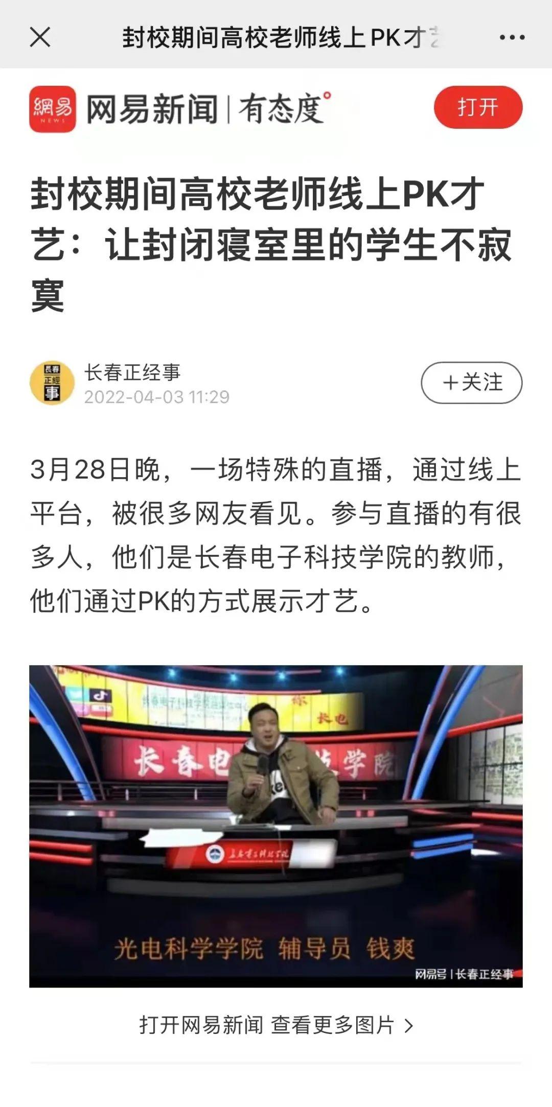 此次活動(dòng)受到了看點(diǎn)快報(bào)、騰訊新聞、網(wǎng)易新聞等多家媒體的關(guān)注和轉(zhuǎn)發(fā),產(chǎn)生了廣泛積極的社會(huì)影響。同時(shí)也受到了學(xué)生家長(zhǎng)們的高度評(píng)價(jià)。學(xué)生家長(zhǎng)看到直播后表示:感謝長(zhǎng)電的老師們,在這個(gè)特殊時(shí)期,能夠這么用心的為學(xué)生們帶來(lái)這么多的歡樂(lè),對(duì)孩子的在校生活也更加放心。