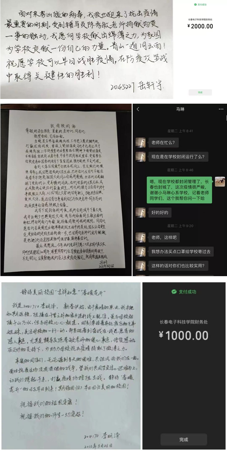 廣大教師積極響應(yīng),第一時間表達(dá)心意。這充分體現(xiàn)了每一位教師的社會責(zé)任于擔(dān)當(dāng),為抗擊疫情貢獻(xiàn)出了一份力量。學(xué)生黨員雖然沒有固定收入,但很多同學(xué)還是希望能夠盡一己綿薄之力,這份心意足以彰顯長電學(xué)子的家國情懷和使命擔(dān)當(dāng)。信息工程學(xué)院岳軒宇同學(xué)、李明澤同學(xué)、馬琳同學(xué)、魯佳録同學(xué)、楊佳明同學(xué)參與其中。李明澤同學(xué)說:“雖然個人力量有限,但團(tuán)結(jié)起來就可以眾志成城!相信在黨的堅(jiān)強(qiáng)領(lǐng)導(dǎo)下,我們一定可以打贏這場‘沒有硝煙的戰(zhàn)爭’!聚沙成塔、水滴石穿、共克時艱,一定能夠迎來‘春天’。”