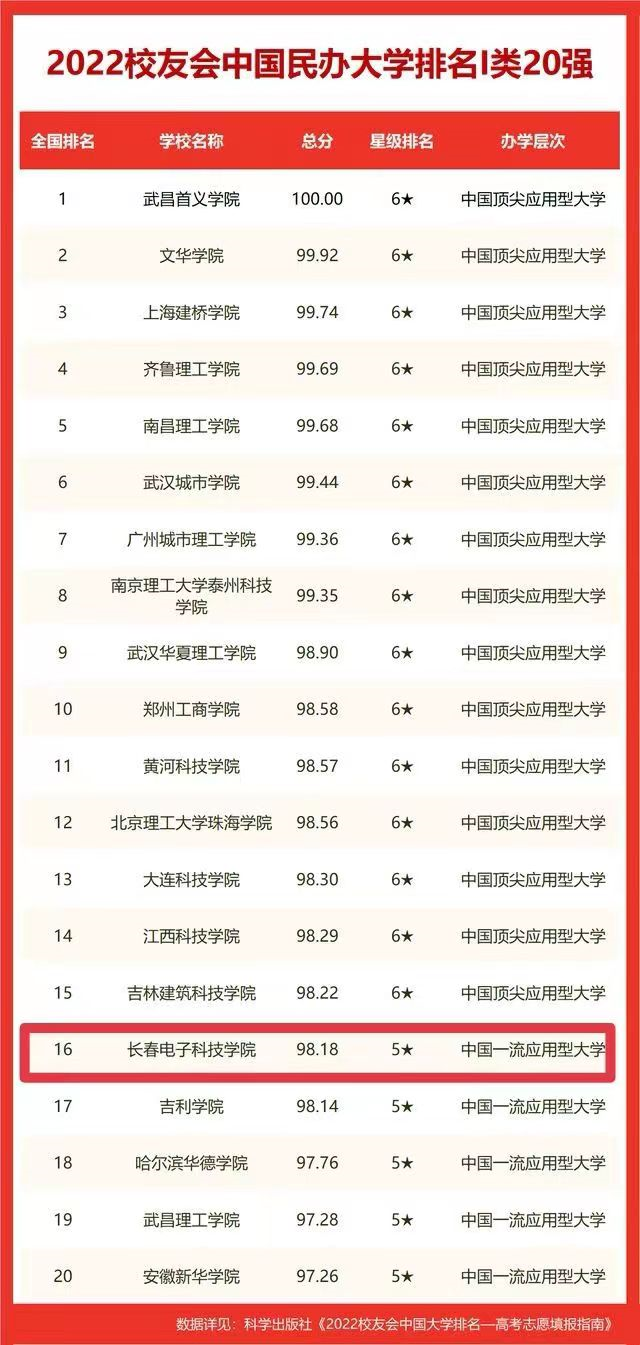 長春電子科技學(xué)院是一所以光電為特色的高水平應(yīng)用型現(xiàn)代產(chǎn)業(yè)大學(xué),是全國唯一一所突出光電為特色的應(yīng)用型理工類院校、全國民辦高校唯一一所電子科技類大學(xué)、在 2022 年中國民辦大學(xué)排名(I類)第 16 位、全國電子通訊類民辦大學(xué)中排名第 1 位、吉林省民辦大學(xué)排名(I類)第 2 位。曾榮獲全國優(yōu)秀民辦高等教育學(xué)校、吉林省文明校園等榮譽(yù)稱號(hào)。學(xué)校依托“中國光學(xué)英才搖籃”長春理工大學(xué)的優(yōu)勢專業(yè),聚焦國家戰(zhàn)略性新興產(chǎn)業(yè)發(fā)展需求,瞄準(zhǔn)國家新工科、新文科建設(shè),重點(diǎn)培養(yǎng)適應(yīng)新興產(chǎn)業(yè)發(fā)展的高素質(zhì)應(yīng)用型人才。