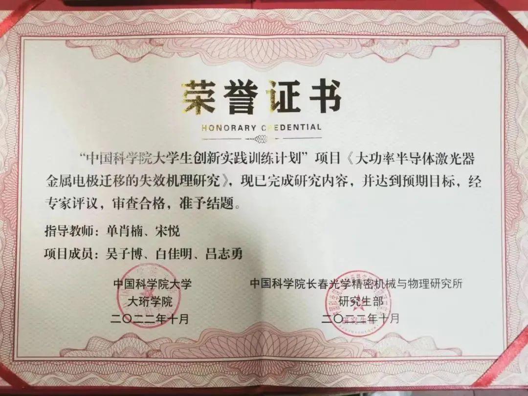 2021 年 10 月 15 日,中國科學院長春光學精密機械與物理研究所(以下簡稱:中科院長春光機所)大學生創(chuàng)新實踐訓練計劃項目審批結果公布,共有 21 個項目獲批。吸引了來自清華大學、哈爾濱工業(yè)大學、華中科技大學、武漢大學、山東大學、吉林大學、北京交通大學、鄭州大學、暨南大學、長春理工大學等高校的近千名學生申請。我校學生吳子博與劉海波教授經(jīng)交流后做了充分調研,成功申請到了“大功率半導體激光器金屬電極遷移的失效機理研究”的參與資格,是我校歷史上申請成功的第一人。
