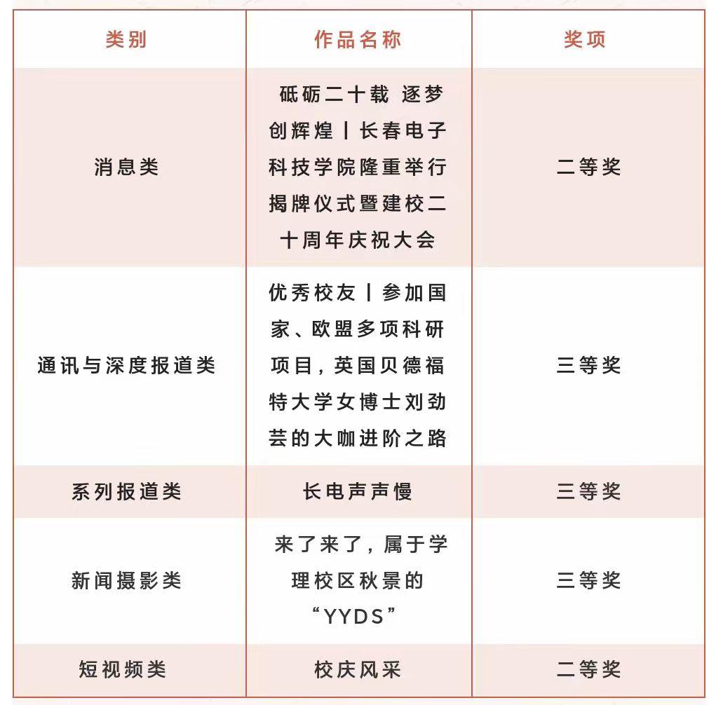 本次評選由吉林省高校新聞工作者協(xié)會主辦,共分為消息、通訊與深度報道、言論、版面、副刊作品、新聞攝影圖片、系列報道、融合創(chuàng)新作品、短視頻作品9個類別。經(jīng)過評選,學(xué)校黨委宣傳部報送的作品喜獲消息類二等獎1項,通訊與深度報道類三等獎1項,系列報道類三等獎1項,新聞攝影類三等獎1項,短視頻類二等獎1項。