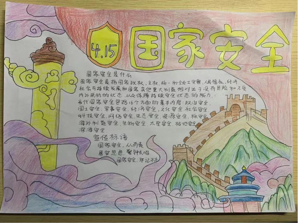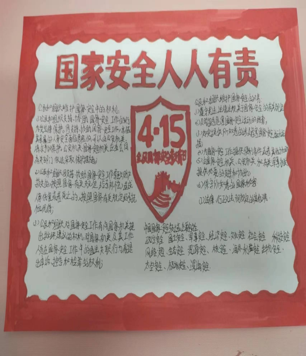 通過繪制安全教育板報(bào),使同學(xué)們深入的了解學(xué)習(xí)國家安全核心概念,進(jìn)而擴(kuò)大宣傳力度,讓同學(xué)們能夠在耳濡目染中,增強(qiáng)對國家安全的責(zé)任意識。
