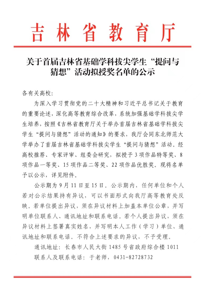 “提問與猜想”活動,引導基礎(chǔ)學科拔尖學生從答問轉(zhuǎn)向提問,面向國家戰(zhàn)略需求、面向自然科學前沿、面向思想文化創(chuàng)新、面向人類未來發(fā)展,主動探究、大膽質(zhì)疑、勇于創(chuàng)新、善于創(chuàng)造,從學習和生活中發(fā)現(xiàn)和提出原創(chuàng)性問題,應(yīng)答和解決挑戰(zhàn)性問題,以思維創(chuàng)新、方法創(chuàng)新、理論創(chuàng)新激發(fā)科學興趣、探索未知世界。本次活動由吉林省教育廳同東北師范大學聯(lián)合舉辦,覆蓋全省66所大學,僅有兩所民辦大學得此殊榮。