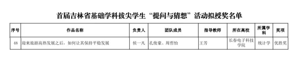 近日,首屆吉林省基礎(chǔ)學科拔尖學生“提問與猜想”活動圓滿落幕。我校商學院王芳老師指導的作品《迎來旅游高熱發(fā)展之后,如何讓其保持平衡發(fā)展》,在眾多團隊中脫穎而出,榮獲優(yōu)勝獎。